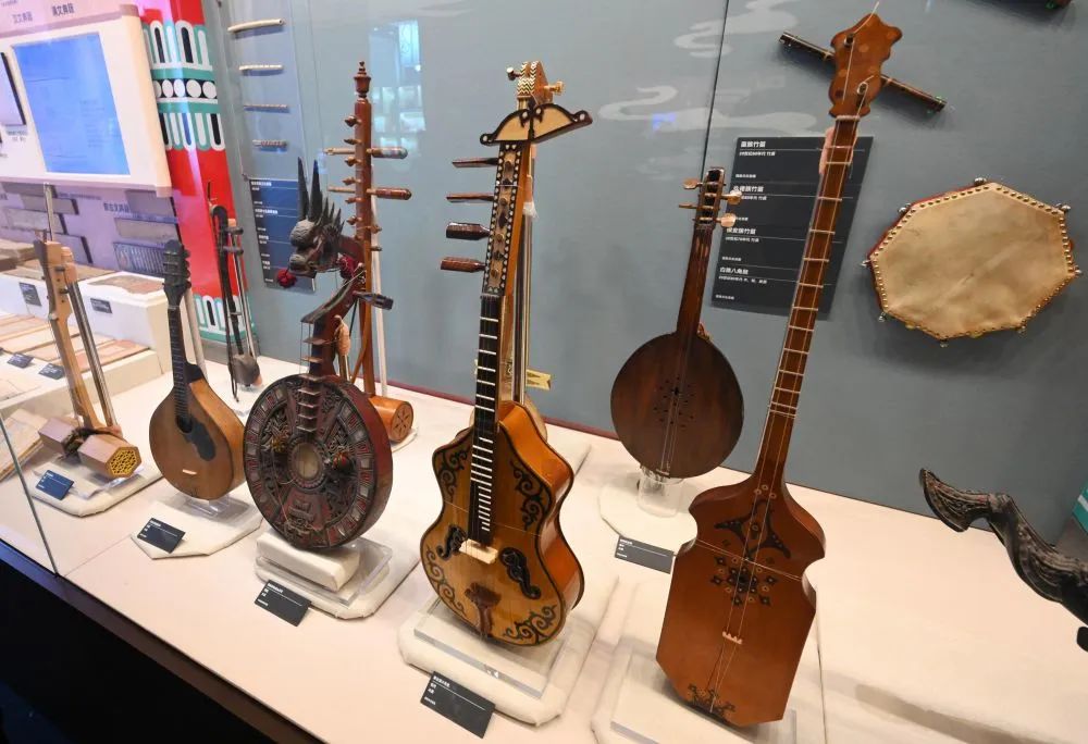 ▲北京民族文化宫“铸牢中华民族共同体意识文物古籍展”展出的民族乐器。新华社记者 陈晔华 摄